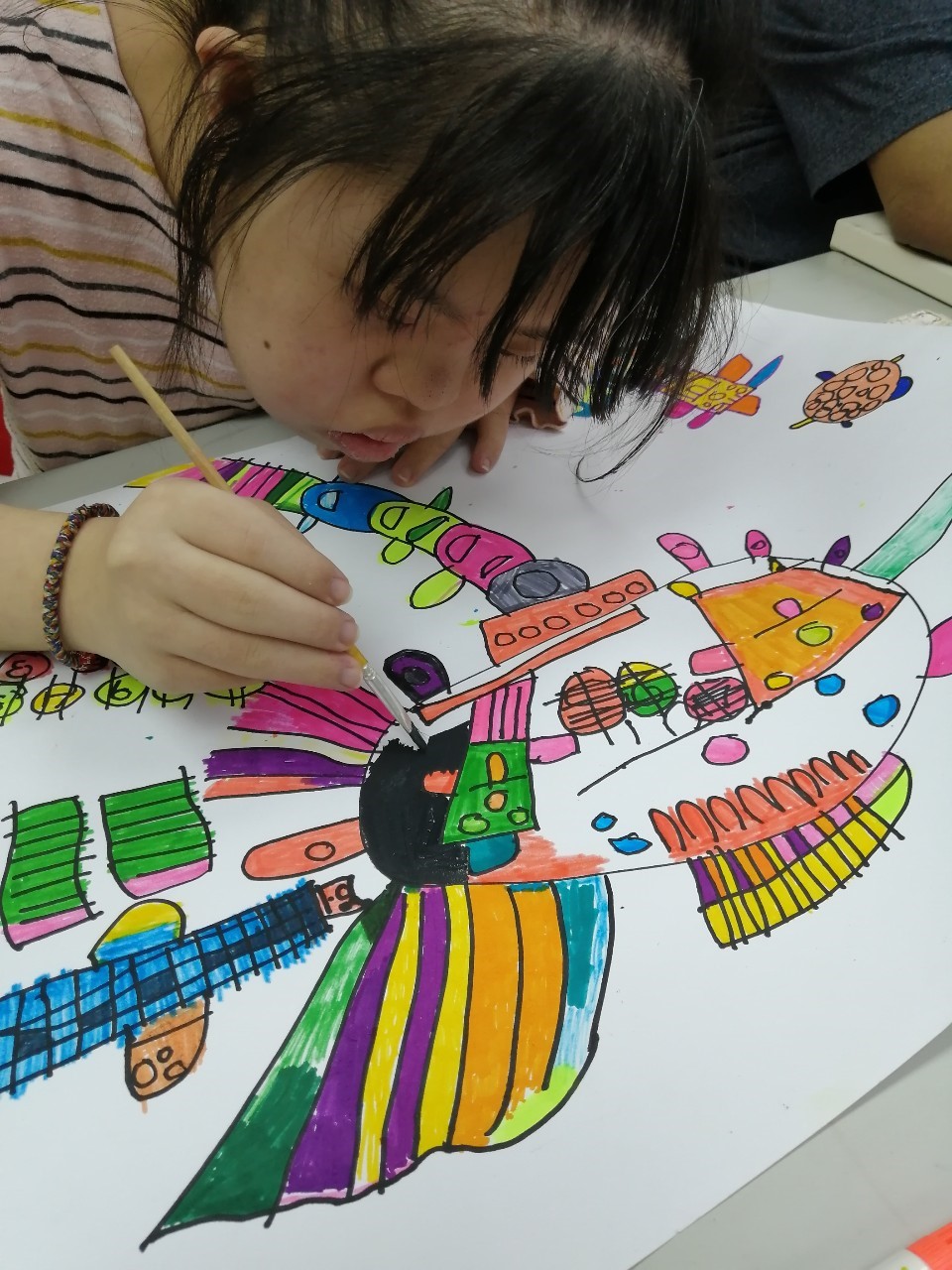 嬌小的安琪,畫中的主角卻有著大而飽滿的身形,線條圓潤順暢而肯定,平時幾乎很少主動說話的安琪,有個「默默公主」稱號,安靜的她,其實正用著自己的角度與哲學,細心觀察著身邊的人事物,內在有股安住而穩定的節奏。細細感受安琪的畫,那像是個不被打擾的純淨小劇場,詼諧有趣的形體源源不絕地在劇中登場,自在發聲,散發著天真的魔力!